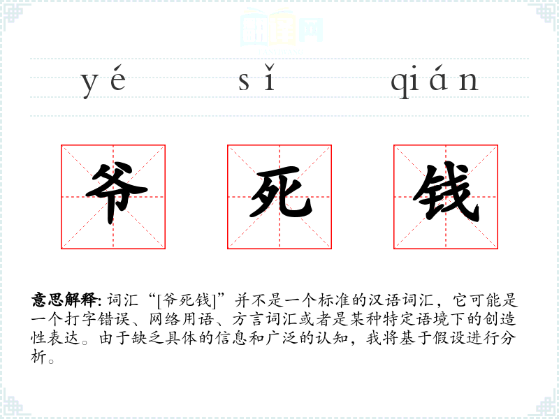 由于“[爷死钱]”不是一个标准的词汇,我们无法给出确切的字面意思和基本含义。它可能是由“爷”(祖父或对年长男性的尊称)、“死”(生命的终结)和“钱”(货币或财富)三个字组合而成的,但这种组合在标准汉语中没有明确的意义。