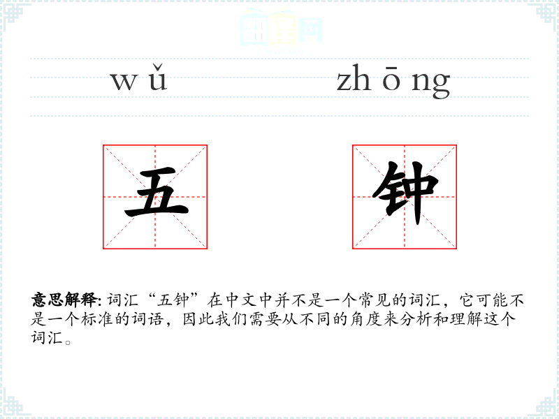 由于“五钟”不是一个标准的词汇,我们无法给出一个确切的字面意思和基本含义。它可能是某个特定领域或方言中的词汇,或者是某个特定语境下的临时组合。