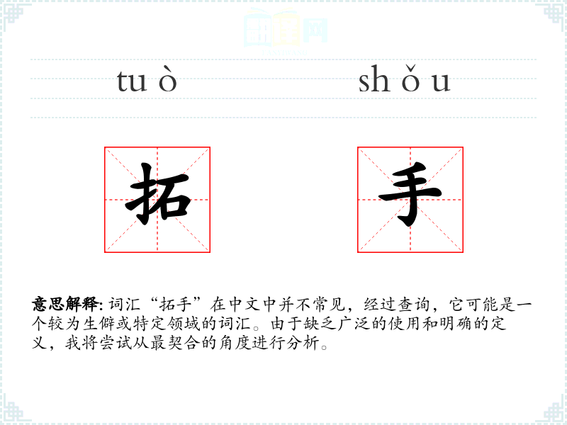 词汇“拓手”在中文中并不常见,经过查询,它可能是一个较为生僻或特定领域的词汇。由于缺乏广泛的使用和明确的定义,我将尝试从最契合的角度进行分析。