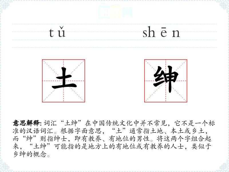 词汇“土绅”在**传统文化中并不常见,它不是一个标准的汉语词汇。根据字面意思,“土”通常指土地、本土或乡土,而“绅”则指绅士,即有教养、有地位的男性。将这两个字组合起来,“土绅”可能指的是地方上的有地位或有教养的人士,类似于乡绅的概念。
