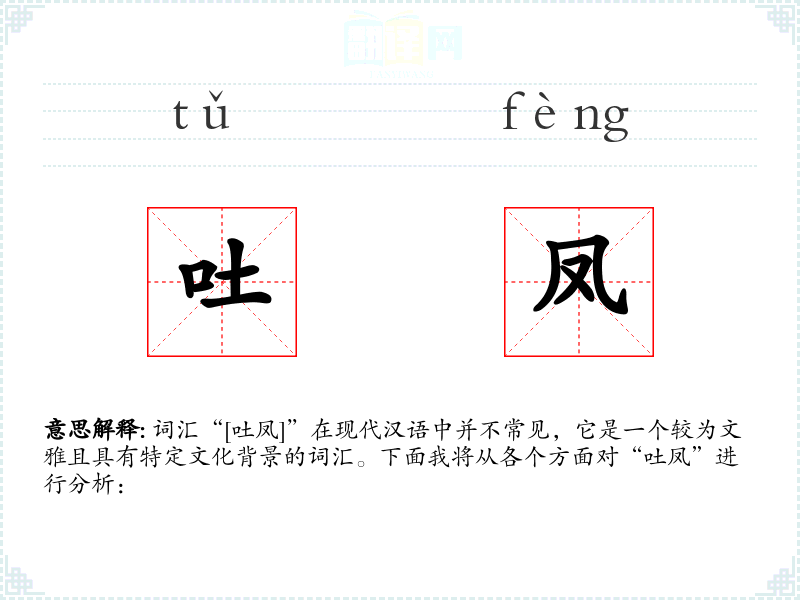 词汇“[吐凤]”在现代汉语中并不常见,它是一个较为文雅且具有特定文化背景的词汇。下面我将从各个方面对“吐凤”进行分析: