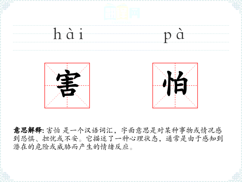 害怕 是一个汉语词汇,字面意思是对某种事物或情况感到恐惧、担忧或不安。它描述了一种心理状态,通常是由于感知到潜在的危险或威胁而产生的情绪反应。
