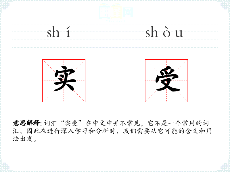 词汇“实受”在中文中并不常见,它不是一个常用的词汇,因此在进行深入学*和分析时,我们需要从它可能的含义和用法出发。