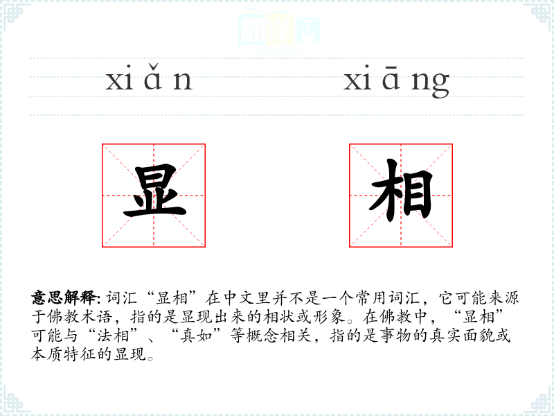 词汇“显相”在中文里并不是一个常用词汇,它可能来源于术语,指的是显现出来的相状或形象。在中,“显相”可能与“法相”、“真如”等概念相关,指的是事物的真实面貌或本质特征的显现。