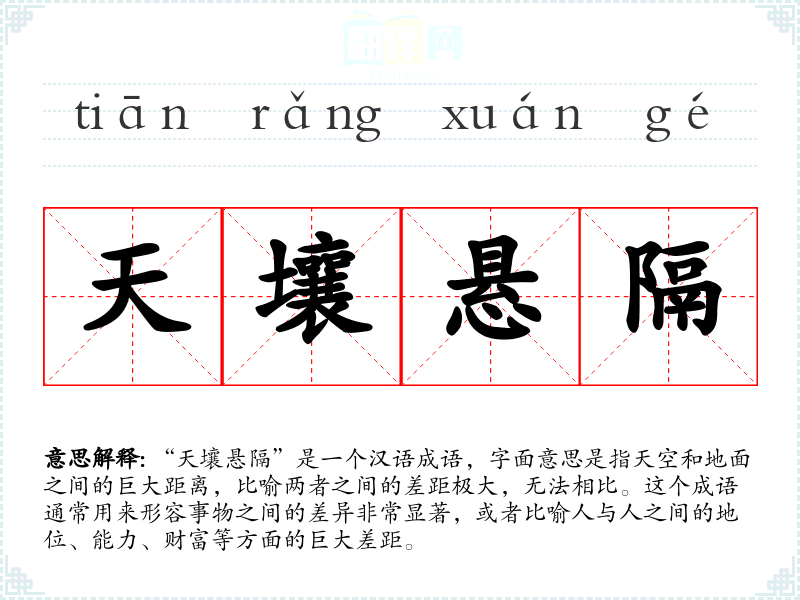 “天壤悬隔”这个成语源自**古代的文学作品,具体出处难以考证,但其形象的比喻手法在古代文学中颇为常见。随着时间的推移,这个成语被广泛应用于各种语境,成为表达巨大差异的常用词汇。