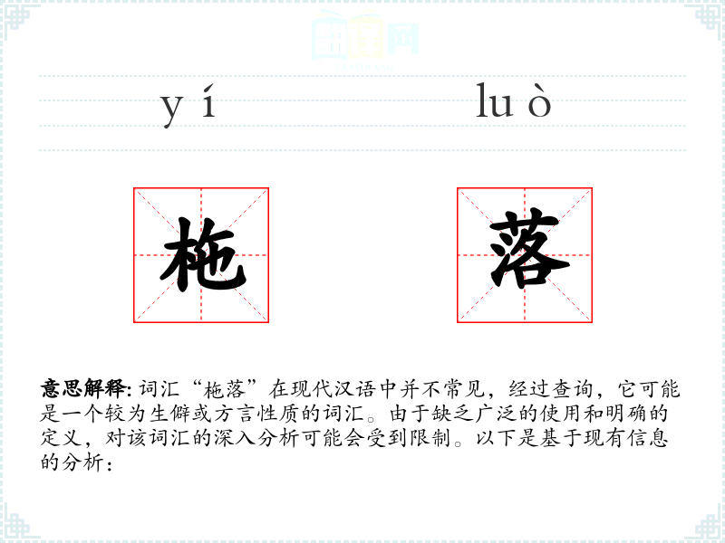 综上所述,词汇“柂落”的分析受到其含义不明确的限制,需要更多的语境信息或专业研究来确定其确切含义和用法。在日常语言学习和使用中,建议关注常用词汇和标准汉语表达。