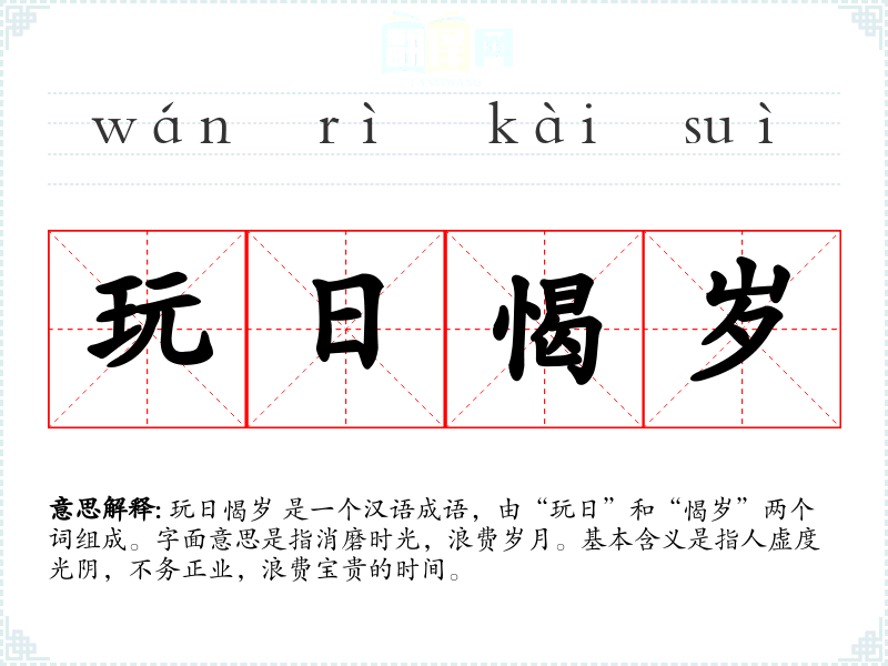 玩日愒岁 是一个汉语成语,由“玩日”和“愒岁”两个词组成。字面意思是指消磨时光,浪费岁月。基本含义是指人虚度光阴,不务正业,浪费宝贵的时间。