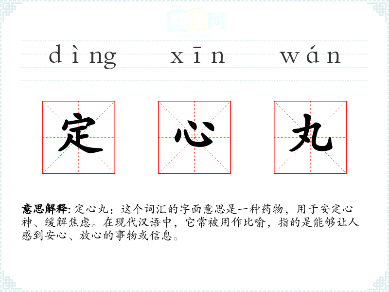 定心丸:这个词汇的字面意思是一种药物,用于安定心神、缓解焦虑。在现代汉语中,它常被用作比喻,指的是能够让人感到安心、放心的事物或信息。