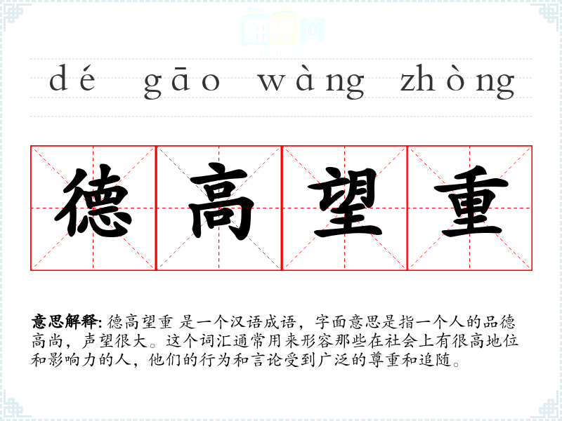 德高望重 是一个汉语成语,字面意思是指一个人的品德高尚,声望很大。这个词汇通常用来形容那些在社会上有很高地位和影响力的人,他们的行为和言论受到广泛的尊重和追随。