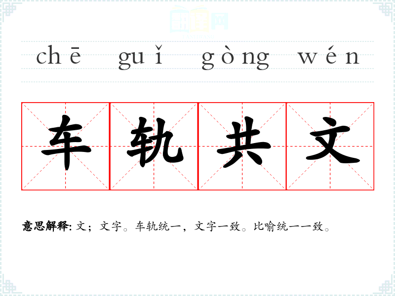 文;文字。车轨统一,文字一致。比喻统一一致。