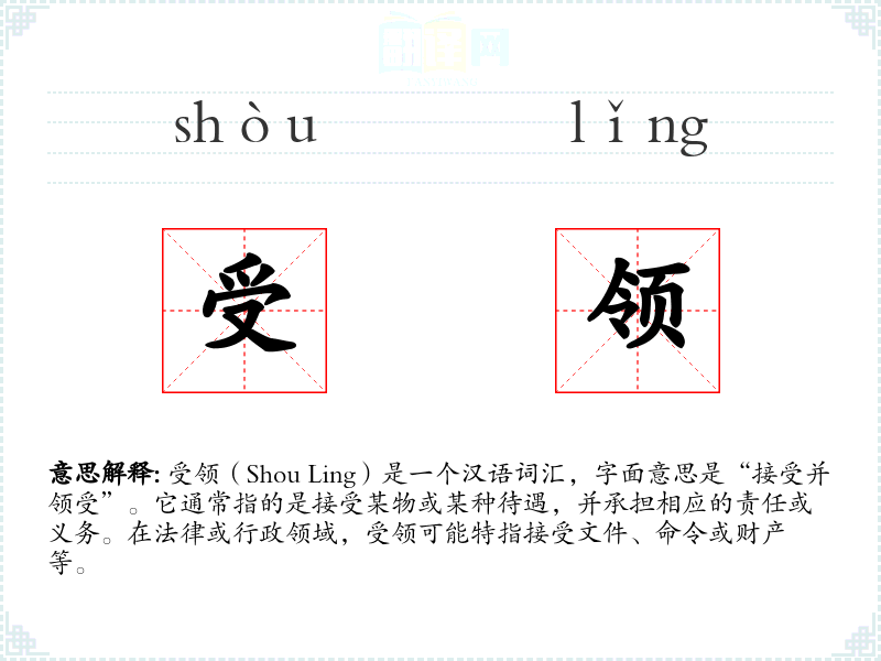 受领(Shou Ling)是一个汉语词汇,字面意思是“接受并领受”。它通常指的是接受某物或某种待遇,并承担相应的责任或义务。在法律或行政领域,受领可能特指接受文件、命令或财产等。