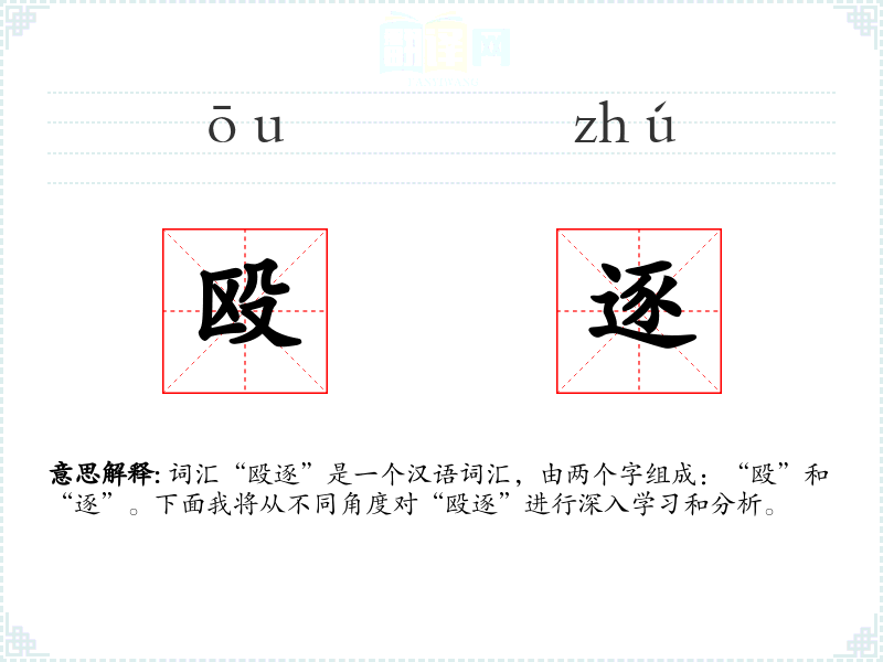 词汇“殴逐”是一个汉语词汇,由两个字组成:“殴”和“逐”。下面我将从不同角度对“殴逐”进行深入学*和分析。