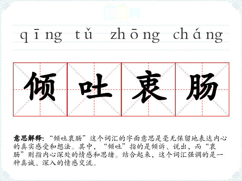 “倾吐衷肠”这个词汇的字面意思是毫无保留地表达内心的真实感受和想法。其中,“倾吐”指的是倾诉、说出,而“衷肠”则指内心深处的情感和思绪。结合起来,这个词汇强调的是一种真诚、深入的情感交流。