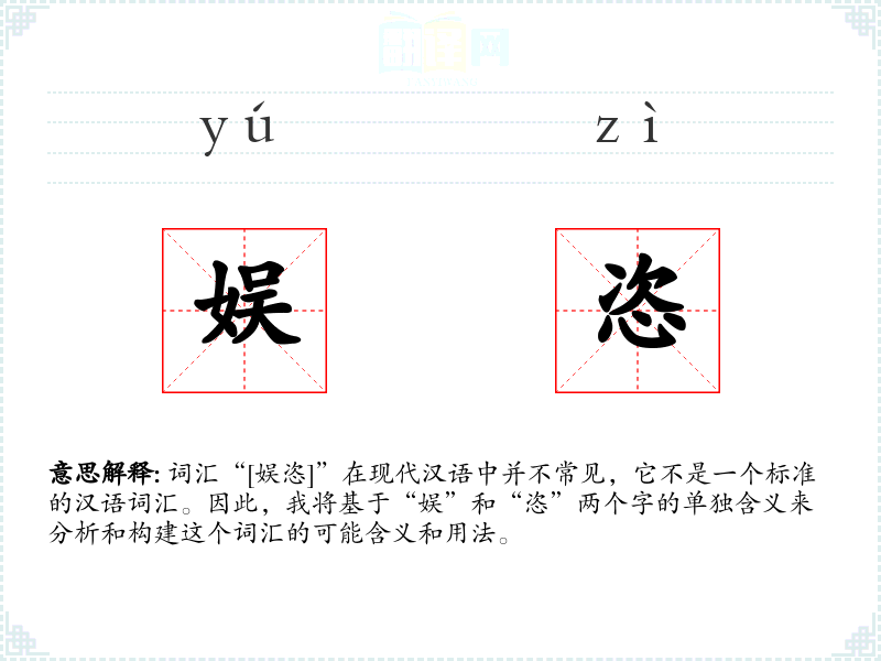 词汇“[娱恣]”在现代汉语中并不常见,它不是一个标准的汉语词汇。因此,我将基于“娱”和“恣”两个字的单独含义来分析和构建这个词汇的可能含义和用法。
