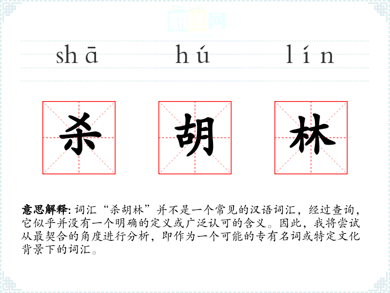 词汇“杀胡林”并不是一个常见的汉语词汇,经过查询,它似乎并没有一个明确的定义或广泛认可的含义。因此,我将尝试从最契合的角度进行分析,即作为一个可能的专有名词或特定文化背景下的词汇。