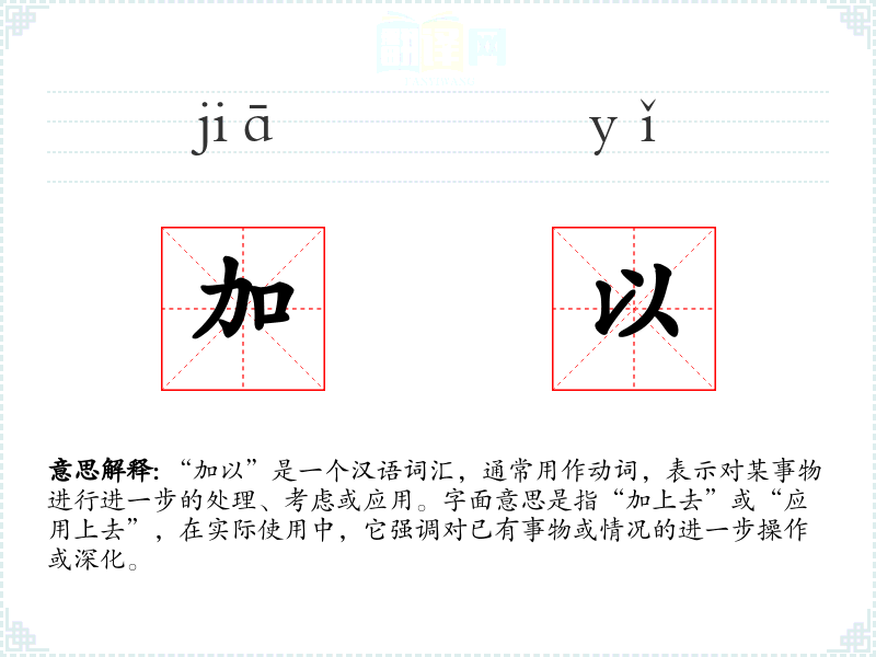 “加以”是一个功能性强的词汇,适用于需要强调进一步动作或深化的场合。在语言学*和表达中,正确使用“加以”可以增强表达的正式性和深度,是提升语言精确度和表达力的有效工具。