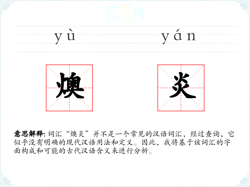 “燠”字来源于古代汉语,意为温暖、热。“炎”字同样源自古代汉语,意为火焰、热气。这两个字组合在一起,可能是在描述一种极端的热状态。