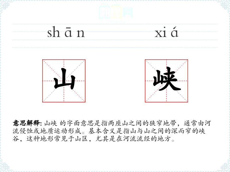 山峡 的字面意思是指两座山之间的狭窄地带,通常由河流侵蚀或地质**形成。基本含义是指山与山之间的深而窄的峡谷,这种地形常见于山区,尤其是在河流流经的地方。
