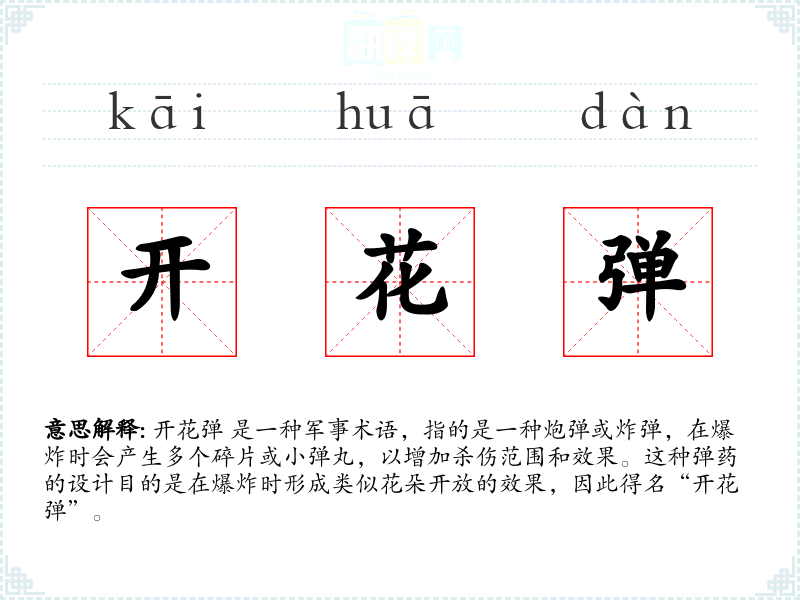 "开花弹"的意思解释、开花弹是什么意思由翻译网汉语词典查词提供。