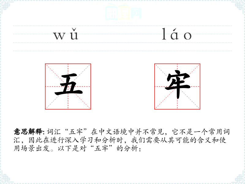 - 反义词:无(由于“五牢”不常用,反义词不明显)