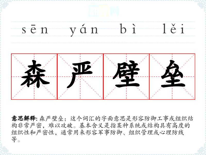 森严壁垒:这个词汇的字面意思是形容防御工事或组织结构非常严密,难以攻破。基本含义是指某种系统或结构具有高度的组织性和严密性,通常用来形容军事防御、组织管理或心理防线等。
