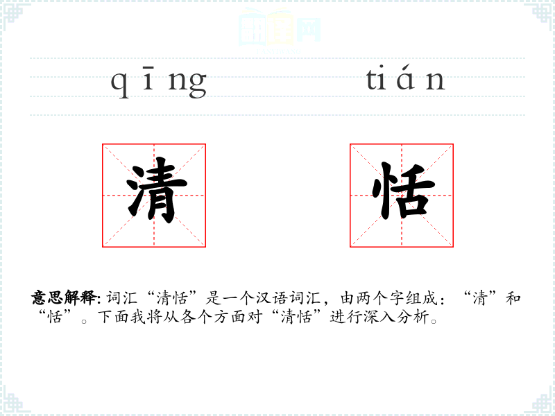 词汇“清恬”是一个汉语词汇,由两个字组成:“清”和“恬”。下面我将从各个方面对“清恬”进行深入分析。