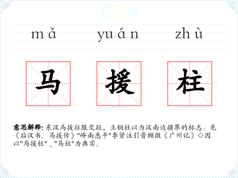 东汉马援征服交趾,立铜柱以为汉南边疆界的标志。见《后汉书.马援传》"峤南悉平"李贤注引晋顾微《广州记》◇因以"马援柱"﹑"马柱"为典实。