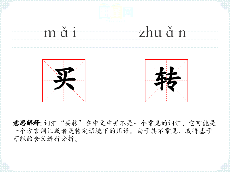 词汇“买转”在中文中并不是一个常见的词汇,它可能是一个方言词汇或者是特定语境下的用语。由于其不常见,我将基于可能的含义进行分析。