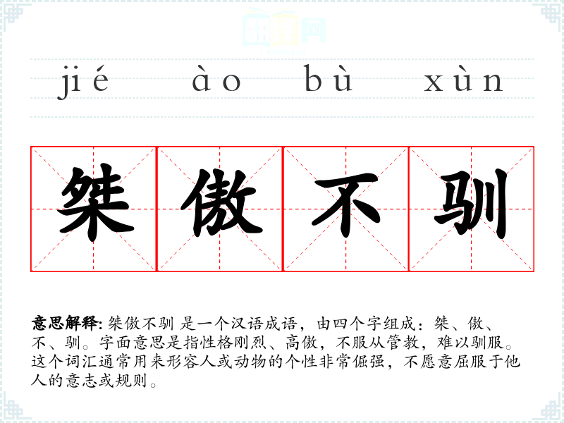 桀傲不驯 是一个汉语成语,由四个字组成:桀、傲、不、驯。字面意思是指性格刚烈、高傲,不服从管教,难以驯服。这个词汇通常用来形容人或动物的个性非常倔强,不愿意屈服于他人的意志或规则。