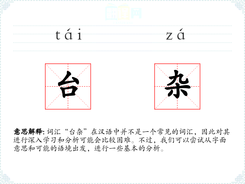 词汇“台杂”在汉语中并不是一个常见的词汇,因此对其进行深入学习和分析可能会比较困难。不过,我们可以尝试从字面意思和可能的语境出发,进行一些基本的分析。