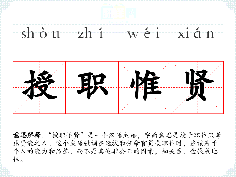 “授职惟贤”是一个汉语成语,字面意思是授予职位只考虑贤能之人。这个成语强调在选拔和任命官员或职位时,应该基于个人的能力和品德,而不是其他非公正的因素,如关系、金钱或地位。