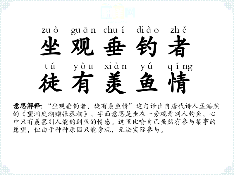 “坐观垂钓者,徒有羡鱼情”这句话出自唐代诗人孟浩然的《望洞庭湖赠张丞相》。字面意思是坐在一旁观看别人钓鱼,心中只有羡慕别人能钓到鱼的情感。这里比喻自己虽然有参与某事的愿望,但由于种种原因只能旁观,无法实际参与。