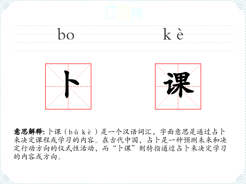 卜课(bǔ kè)是一个汉语词汇,字面意思是通过占卜来决定课程或学*的内容。在古代*,占卜是一种预测未来和决定行动方向的仪式性活动,而“卜课”则特指通过占卜来决定学的内容或方向。