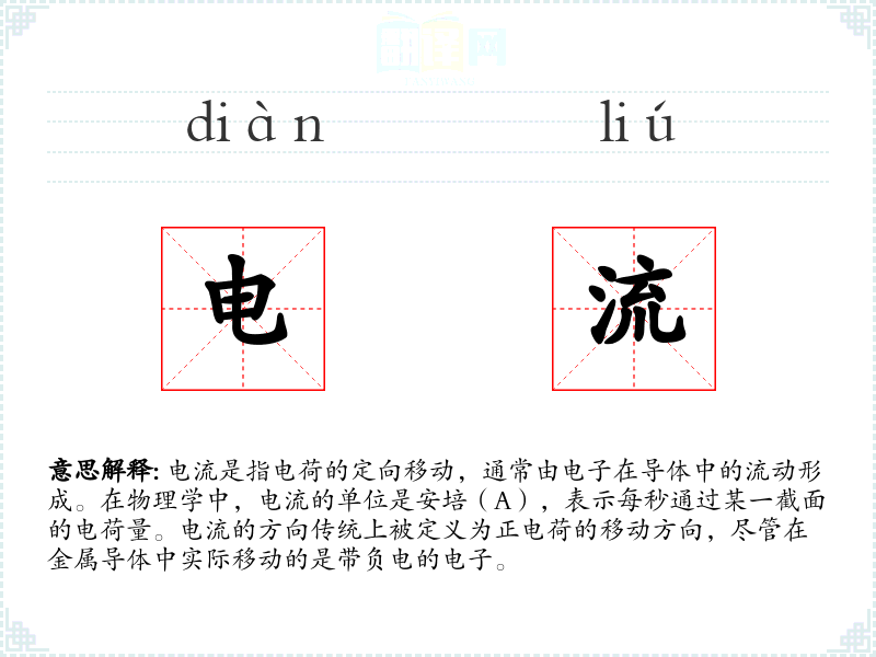 在不同语言中,“电流”通常有相似的表达,如英语中的“electric current”,德语中的“elektrischer Strom”。这些词汇都强调了电荷的流动特性。