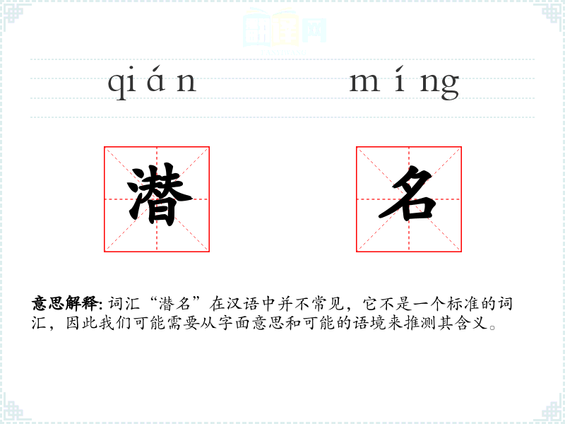 词汇“潜名”在汉语中并不常见,它不是一个标准的词汇,因此我们可能需要从字面意思和可能的语境来推测其含义。