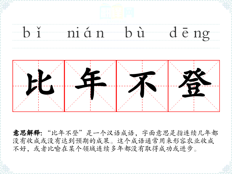 “比年不登”是一个汉语成语,字面意思是指连续几年都没有收成或没有达到预期的成果。这个成语通常用来形容农业收成不好,或者比喻在某个领域连续多年都没有取得成功或进步。