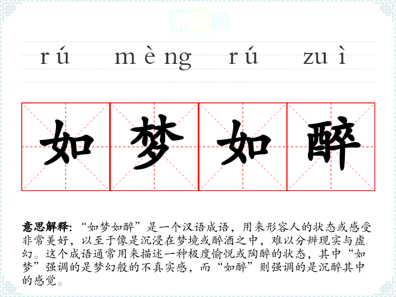 “如梦如醉”是一个汉语成语,用来形容人的状态或感受非常美好,以至于像是沉浸在梦境或醉酒之中,难以分辨现实与虚幻。这个成语通常用来描述一种极度愉悦或陶醉的状态,其中“如梦”强调的是梦幻般的不真实感,而“如醉”则强调的是沉醉其中的感觉。