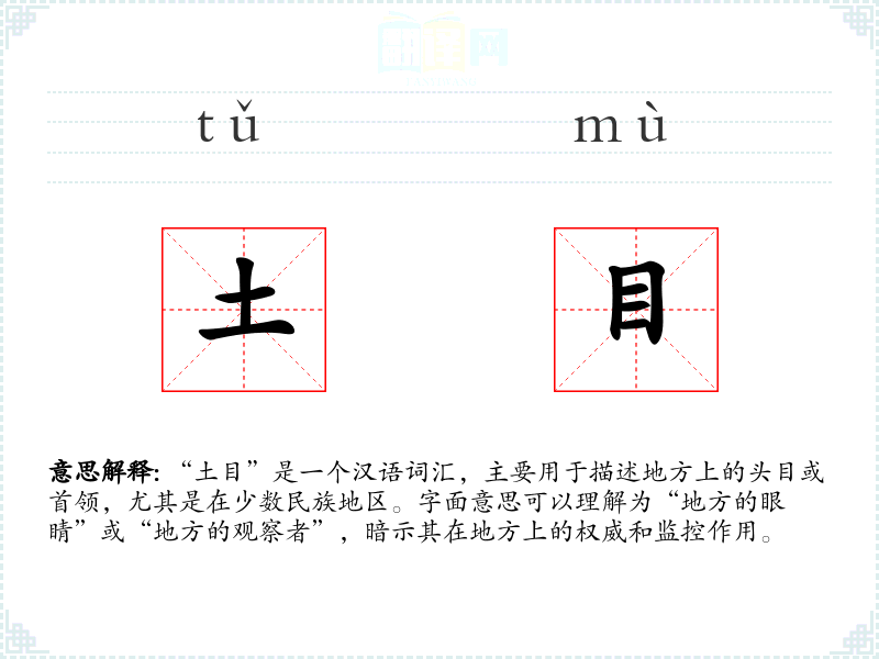 “土目”是一个汉语词汇,主要用于描述地方上的头目或首领,尤其是在少数民族地区。字面意思可以理解为“地方的眼睛”或“地方的观察者”,暗示其在地方上的权威和监控作用。