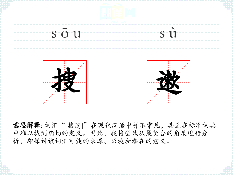 由于“[搜逘]”不是一个标准的现代汉语词汇,我们无法提供一个确切的基本定义。它可能是一个方言词汇、古语词汇或者是打字错误。