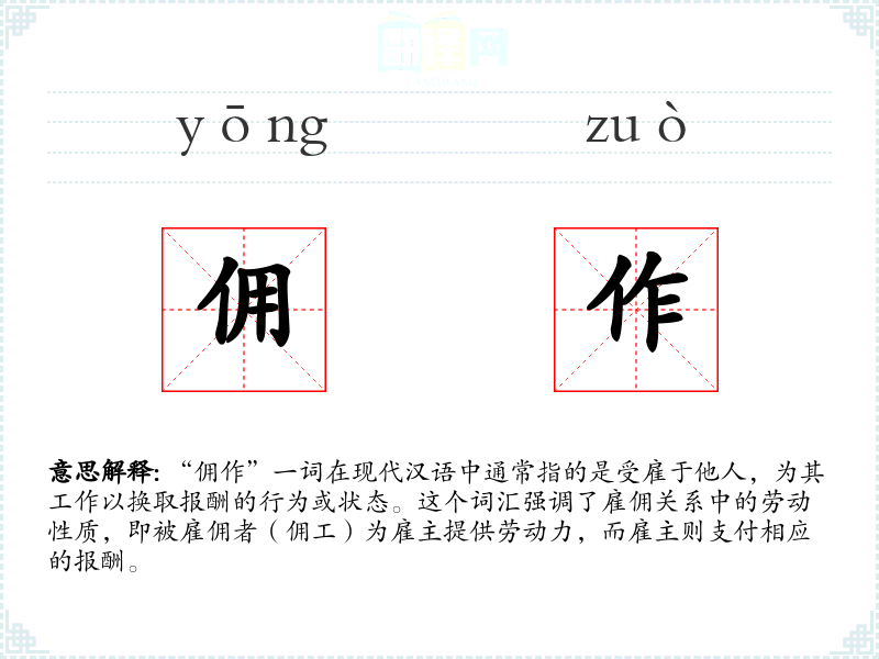 “佣作”一词在现代汉语中通常指的是受雇于他人,为其工作以换取报酬的行为或状态。这个词汇强调了雇佣关系中的劳动性质,即被雇佣者(佣工)为雇主提供劳动力,而雇主则支付相应的报酬。