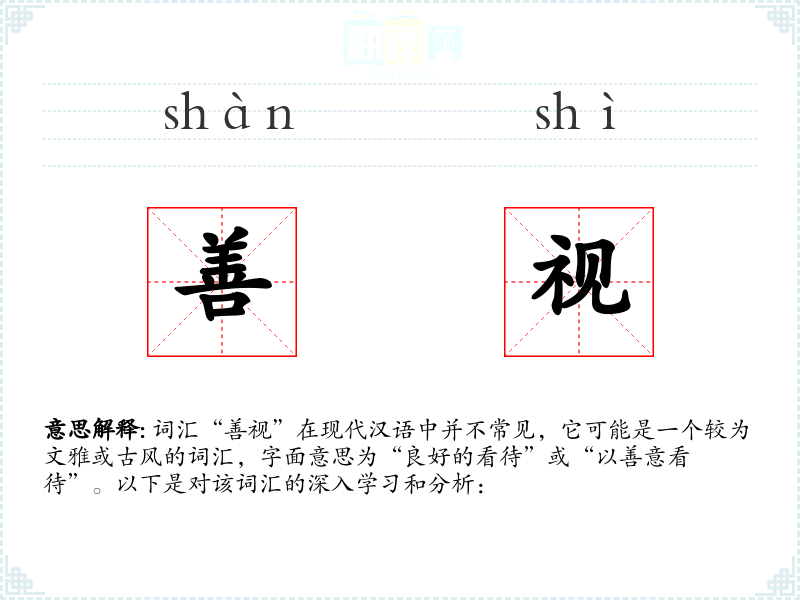 词汇“善视”在现代汉语中并不常见,它可能是一个较为文雅或古风的词汇,字面意思为“良好的看待”或“以善意看待”。以下是对该词汇的深入学*和分析: