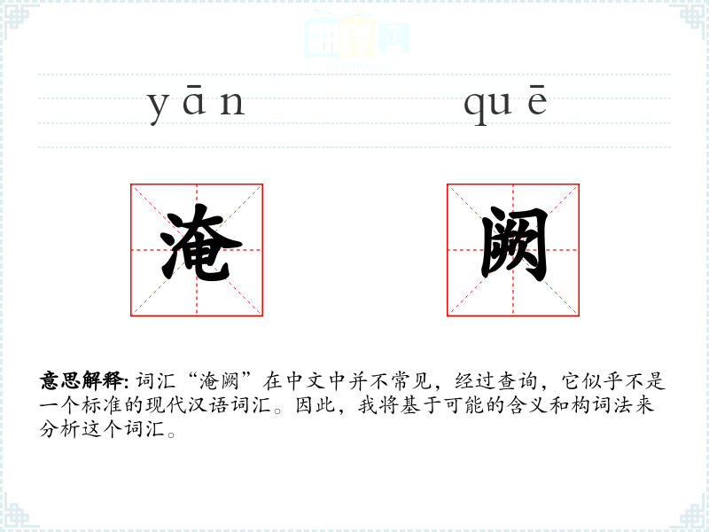 词汇“淹阙”在中文中并不常见,经过查询,它似乎不是一个标准的现代汉语词汇。因此,我将基于可能的含义和构词法来分析这个词汇。