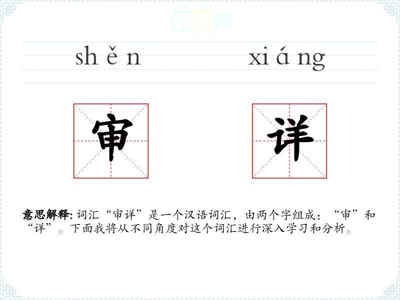 词汇“审详”是一个汉语词汇,由两个字组成:“审”和“详”。下面我将从不同角度对这个词汇进行深入学*和分析。