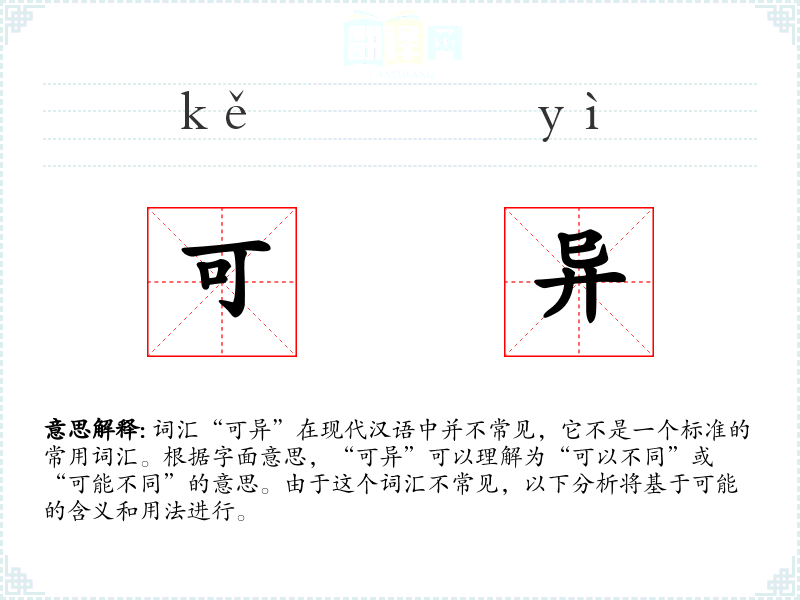 词汇“可异”在现代汉语中并不常见,它不是一个标准的常用词汇。根据字面意思,“可异”可以理解为“可以不同”或“可能不同”的意思。由于这个词汇不常见,以下分析将基于可能的含义和用法进行。