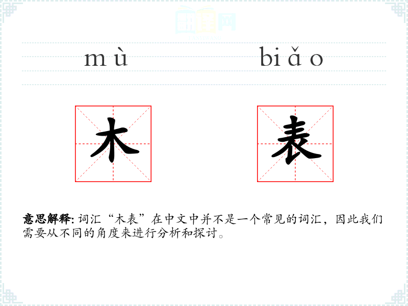 “木表”这个词组由两个汉字组成,其中“木”指的是木材,“表”可以理解为表面或表格。这个词组在古代可能用于描述木制的记录工具或装饰品,但随着时间的推移,它的使用频率逐渐降低。