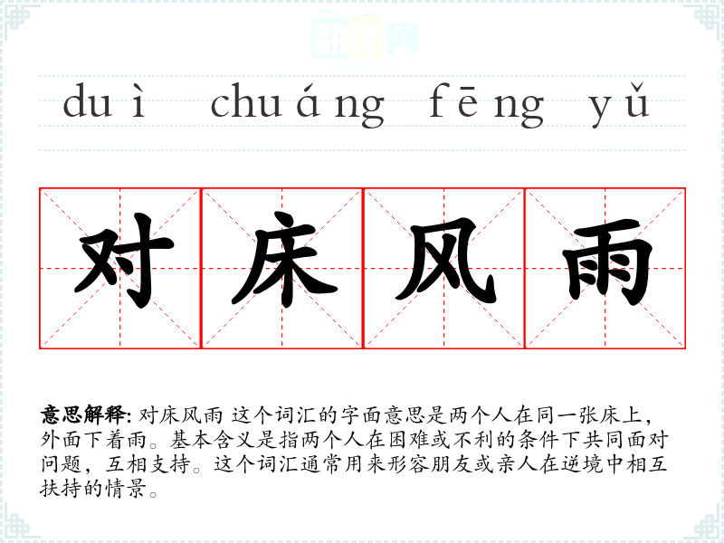 对床风雨 这个词汇的字面意思是两个人在同一张床上,外面下着雨。基本含义是指两个人在困难或不利的条件下共同面对问题,互相支持。这个词汇通常用来形容朋友或亲人在逆境中相互扶持的情景。