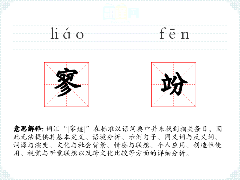 词汇“[寥煋]”在标准汉语词典中并未找到相关条目,因此无法提供其基本定义、语境分析、示例句子、同义词与反义词、词源与演变、文化与社会背景、情感与联想、个人应用、创造性使用、视觉与听觉联想以及跨文化比较等方面的详细分析。