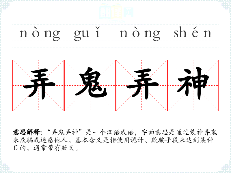 “弄鬼弄神”是一个汉语成语,字面意思是通过装神弄鬼来欺骗或迷惑他人。基本含义是指使用诡计、欺骗手段来达到某种目的,通常带有贬义。