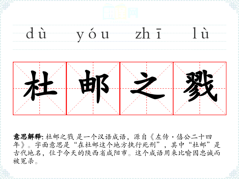 杜邮之戮 是一个汉语成语,源自《左传·僖公二十四年》。字面意思是“在杜邮这个地方执行死刑”,其中“杜邮”是古代地名,位于今天的陕西省咸阳市。这个成语用来比喻因忠诚而被冤杀。