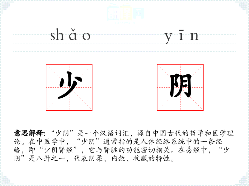 “少阴”一词源于中国古代的阴阳五行理论,其中“阴”代表阴柔、内敛的特性,“少”表示相对较弱或较小的状态。随着时间的推移,这个词汇在中医学和易经中得到了广泛的应用和发展。